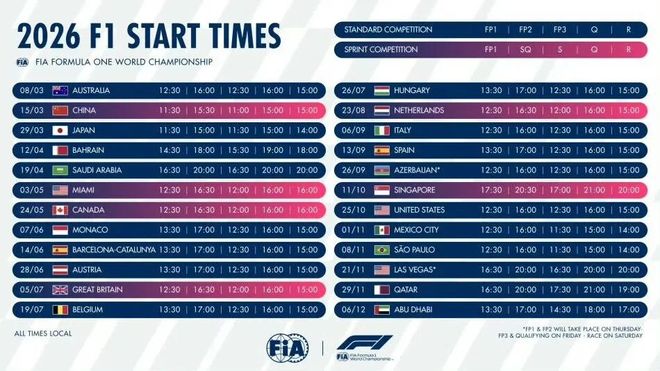F1正式官宣了2026赛季的完整赛历。澳大利亚大奖赛将从3月8日起跑,中国站被安排在了3月13日至15日进行!
