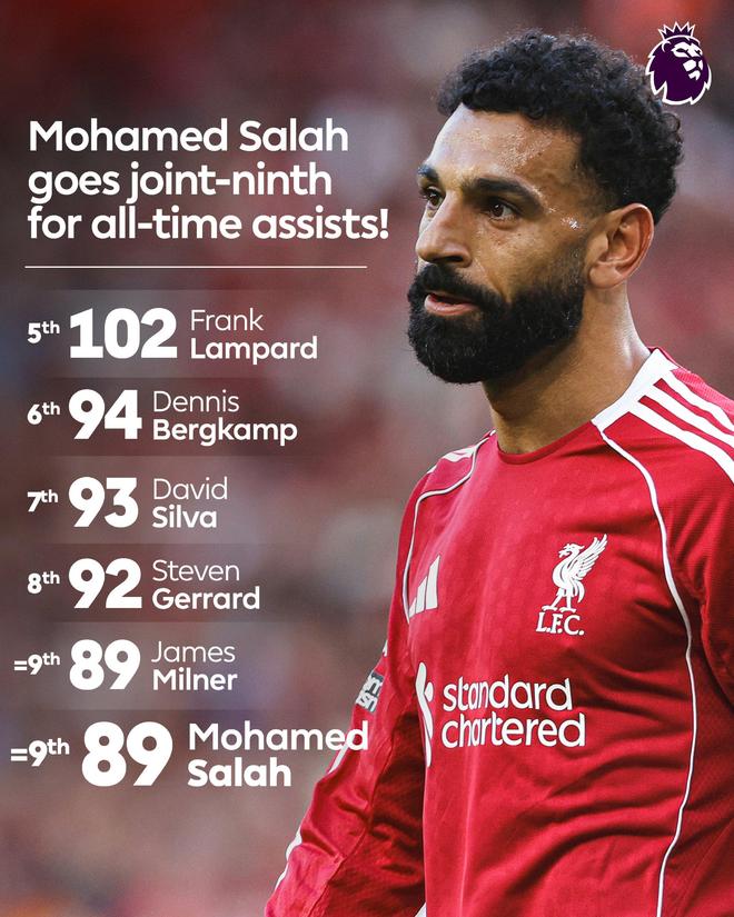 据英超官方数据统计,这也是萨拉赫在英超比赛中的个人第89次助攻,他就此追平前队友米尔纳,升上历史助攻榜第九位。