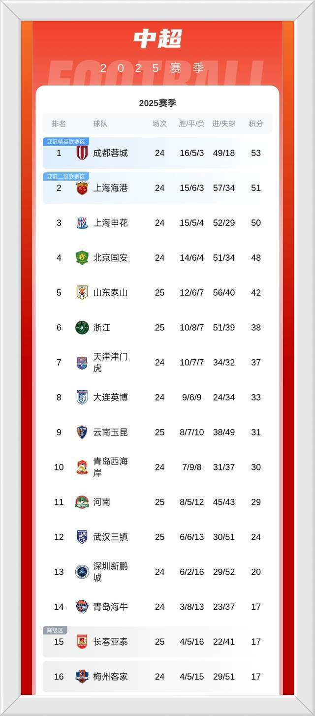 - 中超 | 随着浙江33绝平蓉城,海港32绝杀,申花61,中超冠军基本出炉