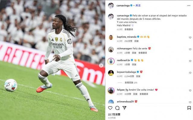 他也在赛后通过社媒晒出自己的比赛照,并配文:“历经五个月艰难时光,很开心终于重新踏上世界最佳球场的草皮——且收获胜利。皇马加油”