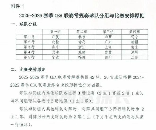虽然新赛季的CBA联赛要等到12月开打,不过各项工作都在有序进行。据媒体人“球圈赵探长”透露,CBA公司已经将《2025-2026赛季CBA联赛常规赛分组与比赛安排原则》下发给了各队,来征求意见。在该文件中,明确了新赛季的分组情况,20支球队总共被分为四个小组,具体分组情况如下:第一组:广厦、北控、山东、天津、宁波;第二组:北京、青岛、浙江、龙狮、福建;第三组:山西、广东、上海、吉林、四川;第四组:辽宁、新疆、南京、深圳、江苏。