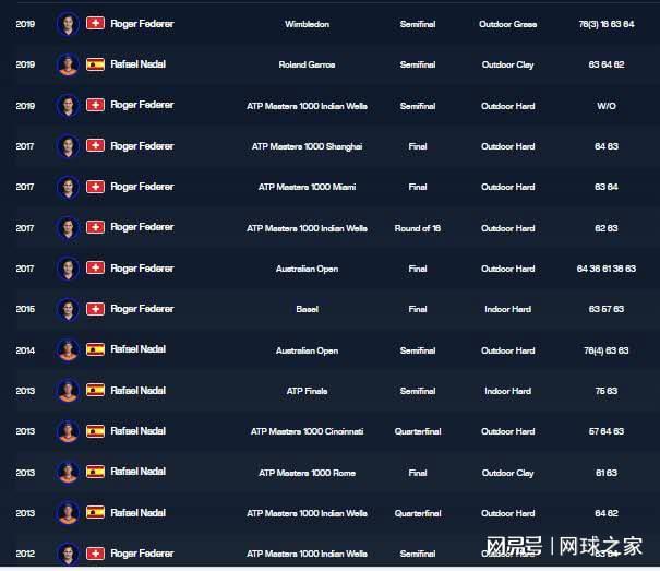 费纳之间最后一次比赛是2019年温网半决赛,费德勒赢得了两人的最后一次交手;在那之前,纳达尔在法网半决赛再次战胜了老对手;再往前数,则是费德勒对阵纳达尔的一波六连胜。