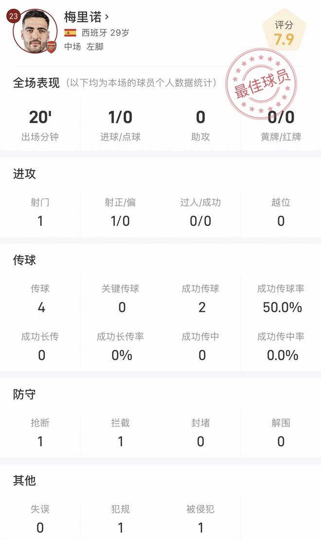 - 英超 | 梅里诺全场数据:替补神兵天降助阿森纳扳平比分+1次抢断