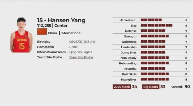 努尔基奇综合评分92分,选秀模板佩科维奇、帕楚里亚,都是非常典型的欧式中锋,小杨综合评分90分,努尔基奇在Athleticism(运动能力)Strength(力量)Quickness(速度)Jump Shot(跳投)Potential(潜力)方面都领先小杨一分,而在Size(尺寸)Defense(防守) Leadership(领导力)Rebounding(篮板)Post Skills(低位技术)方面和小杨平分,而小杨在NBA Ready(NBA准备)方面领先努尔基奇2分,Intangibles(无形资产)领先1分。我们现在以上帝视角来看,小杨的篮板和防守评分明显被高估了,以他目前的篮板表现被评6分都不为过,而在NBA Ready(NBA准备)方面也被高估了,他英语进步幅度不大,对NBA节奏不适应,体能储备不足等都是没做好NBA准备的表现,所以除了Intangibles(无形资产,巨大的中国市场带来经济效益)他确实领先外,其他方面全面落后。