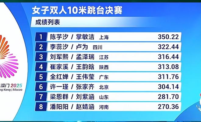11月6日,2025粤港澳全运会进行了双人女子10米台跳水决赛,陈芋汐和掌敏洁联手,奉献了高质量的五跳,以350.22分的高分夺冠。全红婵和王伟莹组合311.76分获得第五,张家齐与许一瑾组合以304.14分获得第六。