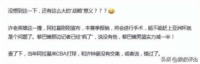 今年夏天,许钟豪代表广厦征战亚冠的赛场,他和黎巴嫩球星阿拉基的对抗导致后者缺席亚洲杯更是被不少球迷调侃,许钟豪“神助攻”中国男篮减少了一个强力的竞争对手。没有阿拉基坐镇的黎巴嫩未能像上一届那样重返决赛的舞台。
