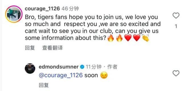 具体什么情况呢,有球迷在萨姆纳的社媒留言询问,大致意思是广东队球迷非常希望你能加盟球队,大家非常兴奋,期待能在俱乐部见到你,能给我们一些消息吗?对此萨姆纳回复的很直接,两个字很快。这让广东球迷看到非常兴奋,“这下有底了”,“看来还是要来的”,“应该是达成协议之类的”,大家都是点赞和期待。