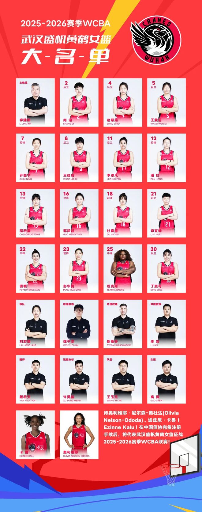 江城篮球热情正盛,武汉盛帆黄鹤女篮蓄势待发,即将开启2025—2026赛季WCBA征程,12月2日将在江夏体育馆迎来主场首战。休赛期球队全力升级阵容:国手王佳琦加盟并任队长,统筹攻防;“建队元老”彭华倩回归,夯实阵容深度。外援方面,埃兹尼·卡鲁将携手佩顿·威廉姆斯、奥利维耶,组成“外援天团”助力冲绩。