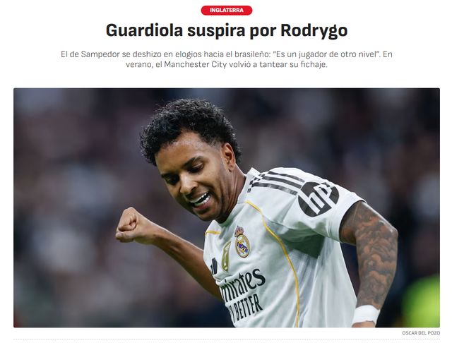去年夏天,瓜迪奥拉的曼城就希望引进罗德里戈,但巴西前锋决定留在皇马,为主力位置而战。《阿斯报》指出,瓜迪奥拉对罗德里戈的欣赏未曾改变,就像这场欧冠赛后,瓜帅第一时间找罗德里戈交流。能得到瓜迪奥拉的长期认可和推崇,这是对罗德里戈实力的认证。