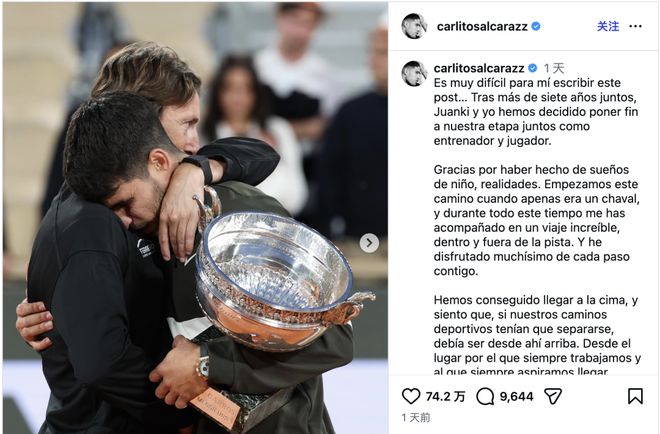 在“分手公告”中,阿尔卡拉斯感谢了费雷罗让自己童年的梦想成真,帮助他“成长为一个更好的人”。他说:“我享受这一路走来的过程,也将永远铭记这段旅程。”