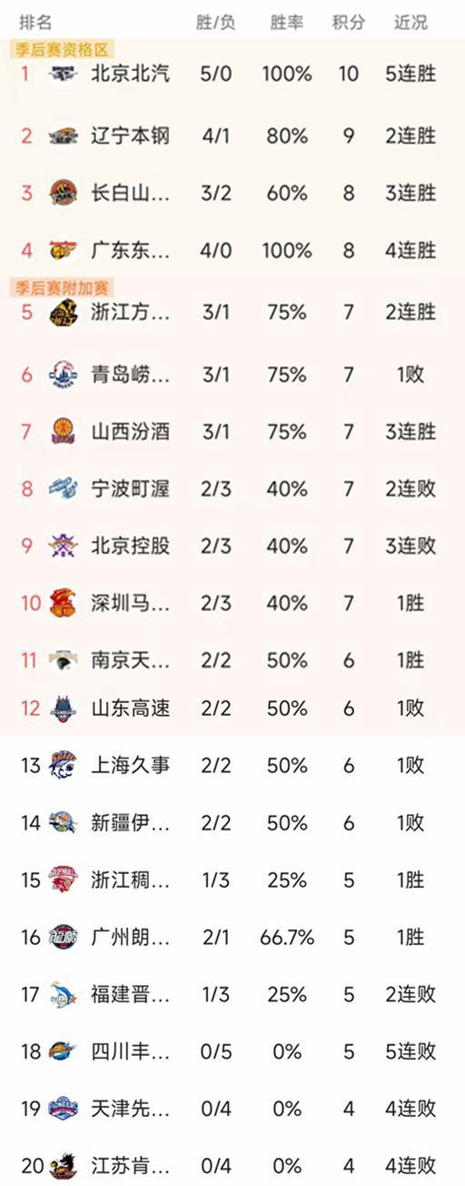 北京大胜,深圳3分绝杀,CBA第5轮结束4场比赛,最新积分榜如下