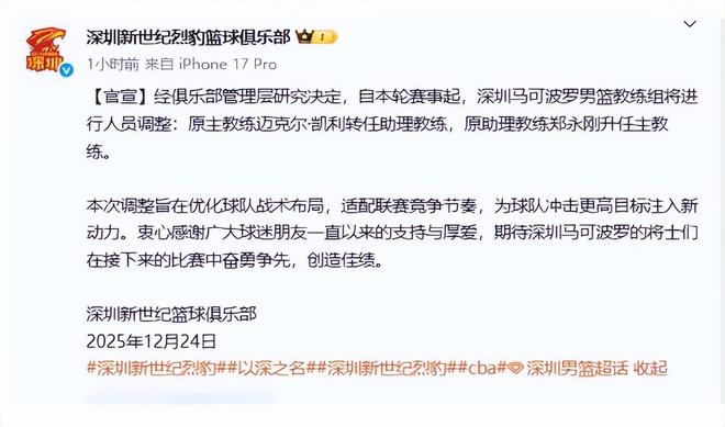 然而,今天上午,一则消息传来,让大家都感到意外。这则消息是深圳男篮发布的。消息内容是:“经俱乐部管理层研究决定,自本轮赛事起,深圳马可波罗男篮教练组将进行人员调整:原主教练迈克尔-凯利转任助理教练,原助理教练郑永刚升任主教练。”这就是说,澳大利亚籍名帅迈克尔・凯利(KELLY MICHAEL CLANCY),在深圳只带队打了5轮,就被拿下了,转为助理教练了。迈克尔·凯利生于1967年11月20日,球员时代,一直在澳大利亚NBL联赛效力,拿过总冠军,当过最佳防守球员,当选过总决赛MVP。执教生涯拿过最佳主教练称号,还当过澳大利亚国家队主教练,带领澳大利亚男篮拿过亚洲杯冠军。