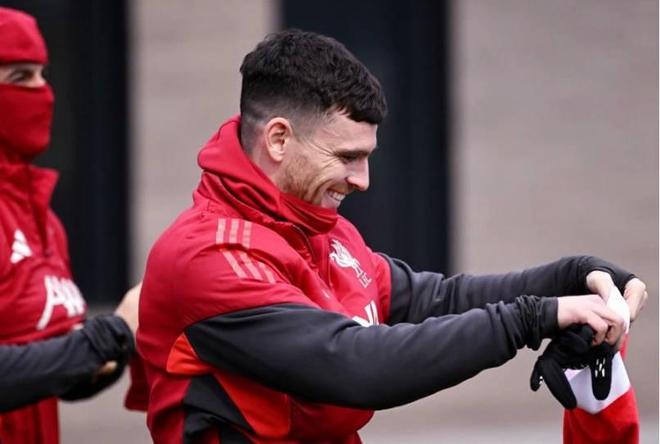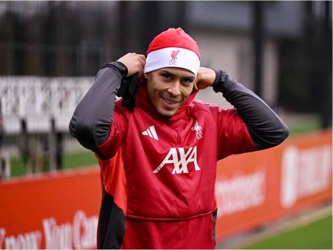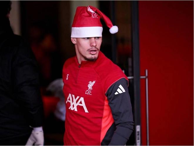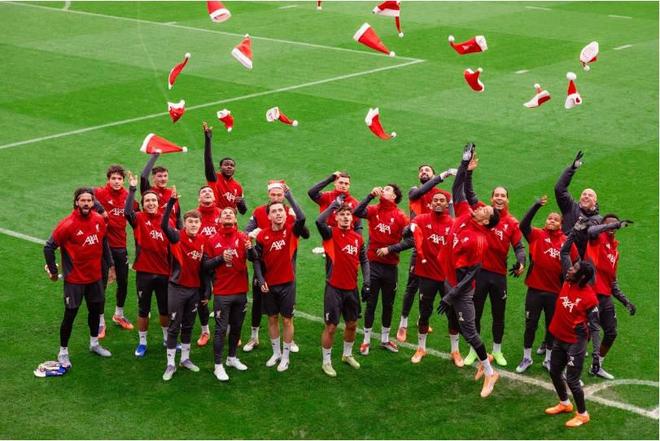 当地时间12月24日上午,利物浦球员戴上圣诞帽参加训练,并且进行了传统的合影。