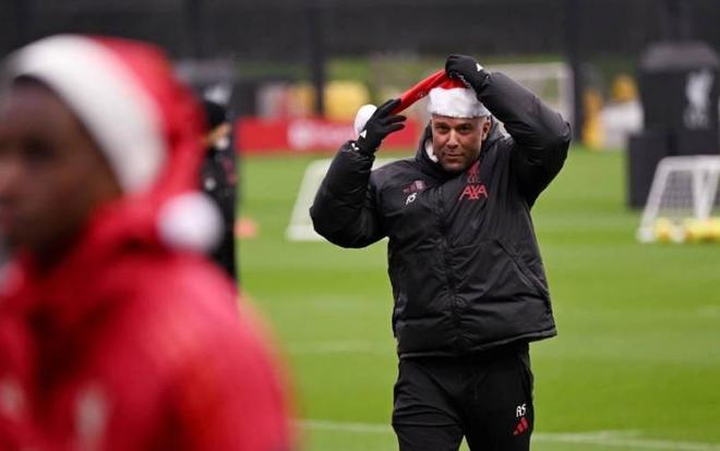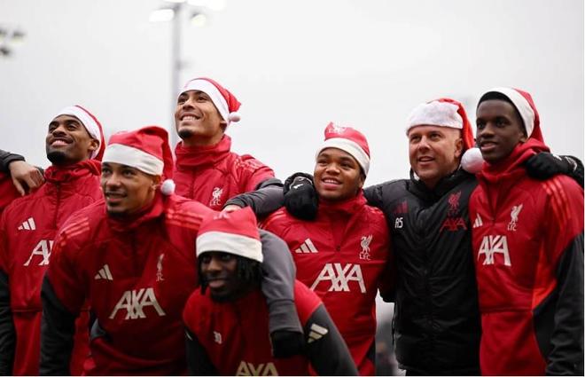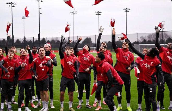 今天是圣诞节前夕,在这一天,利物浦的球员和教练们都戴上了圣诞帽来到训练场,并且进行了大合影,随即一起将圣诞帽掷向空中。